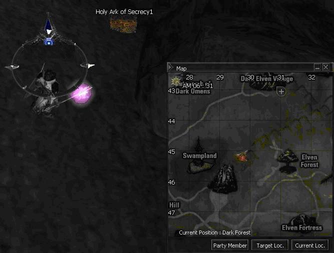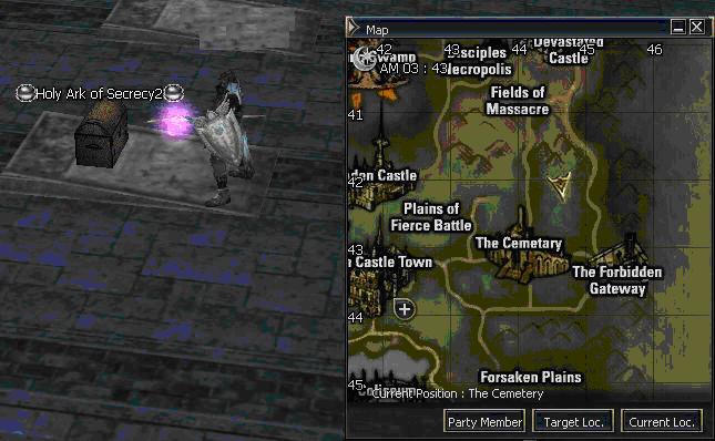 5- Agora vá para o Cemitério, localize o chest (baú) conforme o mapa abaixo. Fale uma vez com ele. Aparecerá um Anjo (é um Quest Monster). Você deverá matá-lo. Fique tranquilo pois ele é fraquinho e morre fácil.Após matá-lo, Você receberá uma chave. Fale novamente com o baú e você receberá um item (não tenho certeza do nome mas se não me engano é Book of Saints)