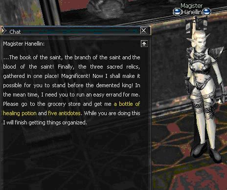 13- Retorne à Dark Elf Guild Guild de Aden para entregar os itens à Magister Hanellin. Ela pedirá para você entregar mais alguns itens a ela.Compre na Grocery (tem em qualquer cidade, inclusive em Aden mesmo) 1 Healing Potion (aquela pocao de cura vermelha) e 5 Antidote (aquela plantinha verde).
