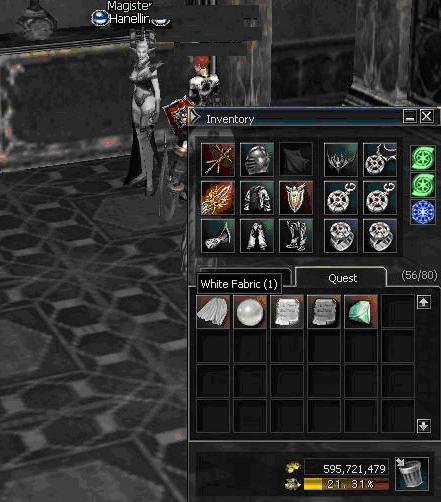 14- Leve estes itens para a Magister Hanellin novamente, escolha a primeira opção (não lembro o texto). Ela te dará 49k de adena e mais um item chamado White Fabric. Parece uma toalha branquinha e aparece no Inventário de Quest.