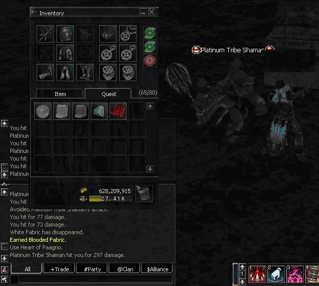 Lá você deverá ficar batendo (sem arma na mão, no soco mesmo) em Platinium Tribe Shaman ou Overlord até que o seu item White Fabric (a toalha da quest) fique vermelha (suja de sangue). Quando ela ficar vermelha, mudará o nome para Blooded Fabric.