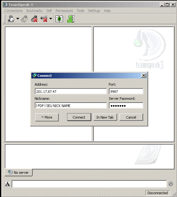 Apos Clicar em connect , Coloque o IP 201.17.8747 , e dps Teu Nick name e uma Senha ..